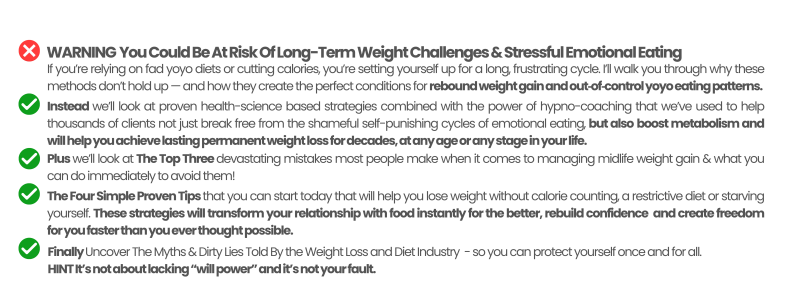 "Before I found Heather's program, I was dreading the thought of our upcoming family holiday in Thailand. I hated having to try on my holiday clothes that I knew wouldn't fit and the thought of wasting money buying new bigger sized ones. I avoided looking at myself in the mirror. That was when I sought Heather's help and shed nearly 50lb (22kg) in a couple of months. In just a few sessions Heather helped me resolve my sweet tooth and emotional eating pattern backed up by virtual gastric lap banding through hypnosis. Now, I feel as though I couldn't overeat even if I tried!" Carole 44